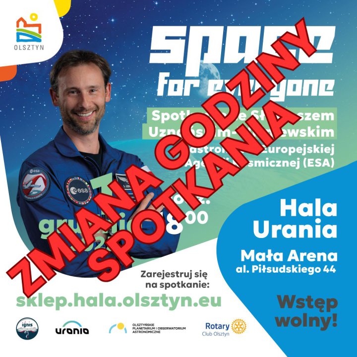 Dr Sławosz Uznański-Wiśniewski przekazał informację o nagłej zmianie w swoim kalendarzu służbowym. W związku z tym wydarzenie rozpocznie się o 19:30.