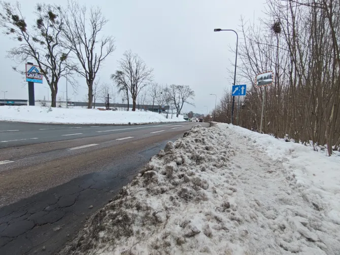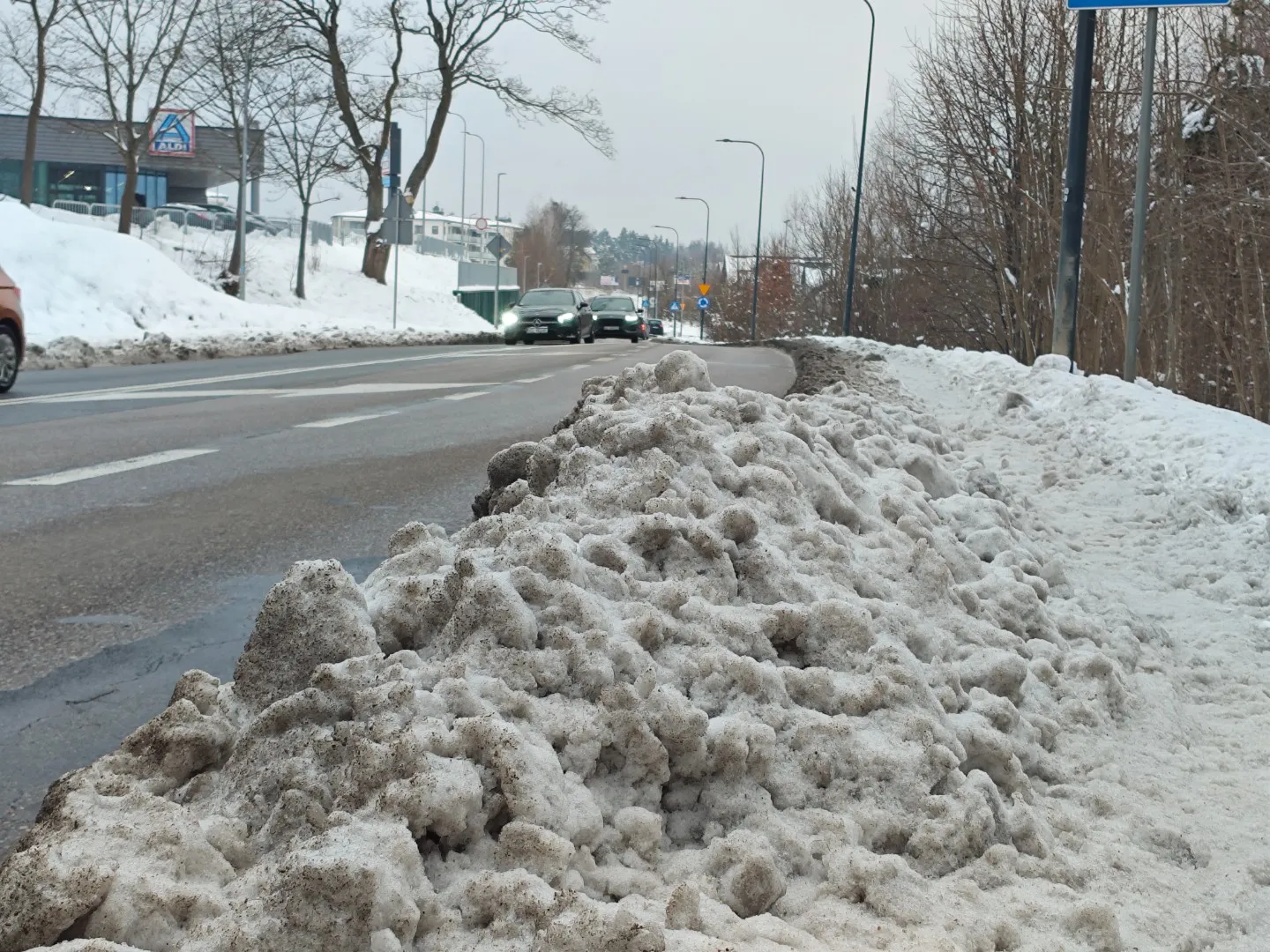 Ulica Bartąska przy Aldi. Na chodniku oprócz ubitego, zlodowaciałego śniegu, który grozi połamaniem nóg zaspy śniegu z odśnieżania drogi i wyjazdu z Aldi. Nikt nie traktuje poważnie biedaków bez aut.