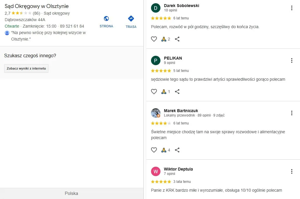 Komentarze w Google pod sądem w Olsztynie zrobiły mi dzień. "Artyści sprawiedliwości" !