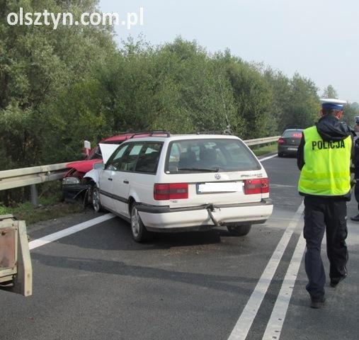 Policjanci pracowali na miejscu zdarzenia drogowego, do którego doszło dziś na krajowej 16. Ze wstępnych ustaleń policjantów wynika, że kierowca jadący volkswagenem passatem w kierunku Olsztyna stracił panowanie nad kierownicą i zderzył się czołowo z jadącym z naprzeciwka fordem.