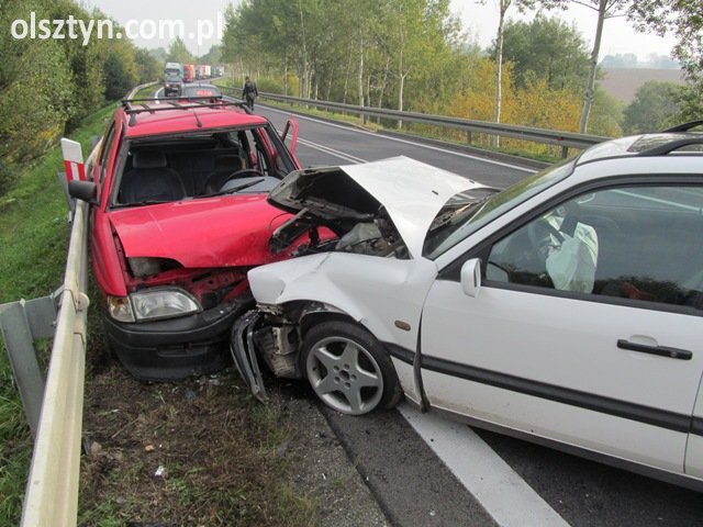 Policjanci pracowali na miejscu zdarzenia drogowego, do którego doszło dziś na krajowej 16. Ze wstępnych ustaleń policjantów wynika, że kierowca jadący volkswagenem passatem w kierunku Olsztyna stracił panowanie nad kierownicą i zderzył się czołowo z jadącym z naprzeciwka fordem.