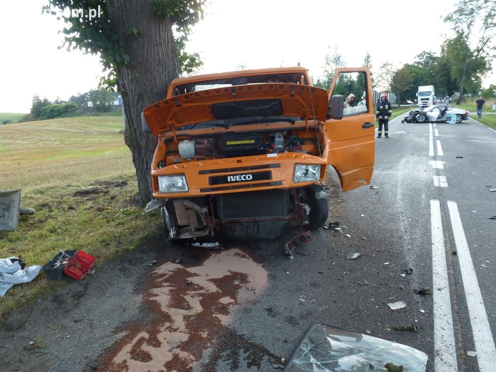 Policjanci pracowali przy zdarzeniu drogowym, w który kierowca porsche zjechał na przeciwległy pas ruchu i uderzył w iveco.