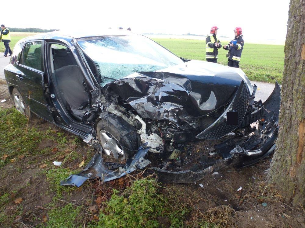 Policjanci pracowali na miejscu wypadku, do którego doszło na trasie Linowiec-Grodziczno. Ze wstępnych ustaleń wynika, że kierujący osobową mazdą w trakcie wyprzedzania samochodu ciężarowego stracił panowanie nad autem i uderzył w przydrożne drzewo.